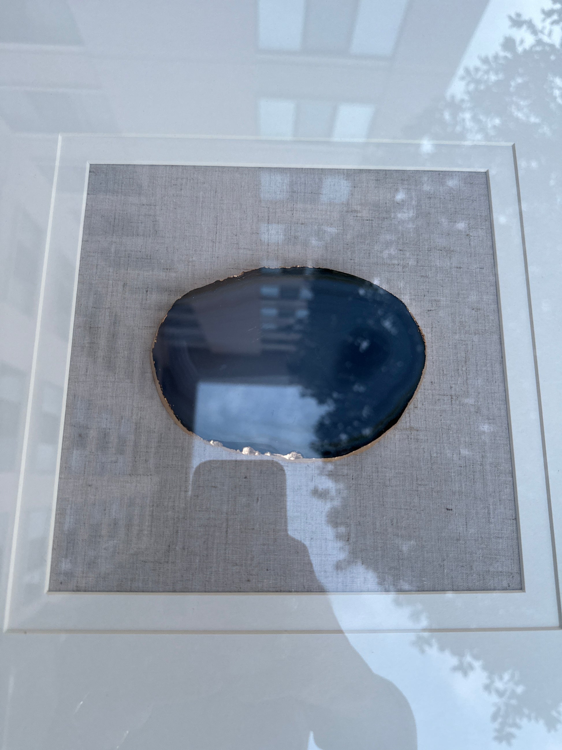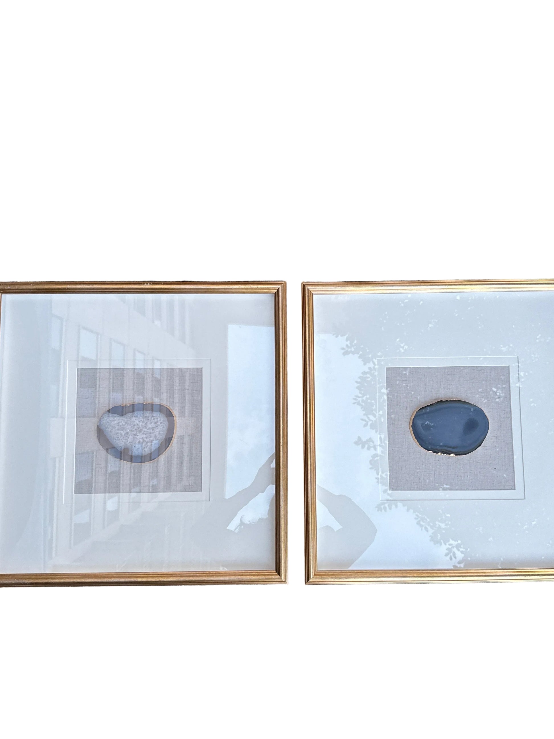 This pair of Agate shadow box art highlights a rare agate stone specimen as nature's artwork. Hand-painted gold edging enhances the stone's natural veining, while the offset mounting creates dimensionality within the frame. The pine wood construction with gold leaf application provides an understated yet refined backdrop for the mineral centerpiece. Light reflection on the agate's surface changes throughout the day, making this piece constantly evolving artwork. The linen backing offers textural contrast to the smooth stone and polished frame, completing this naturally luxurious wall accent.