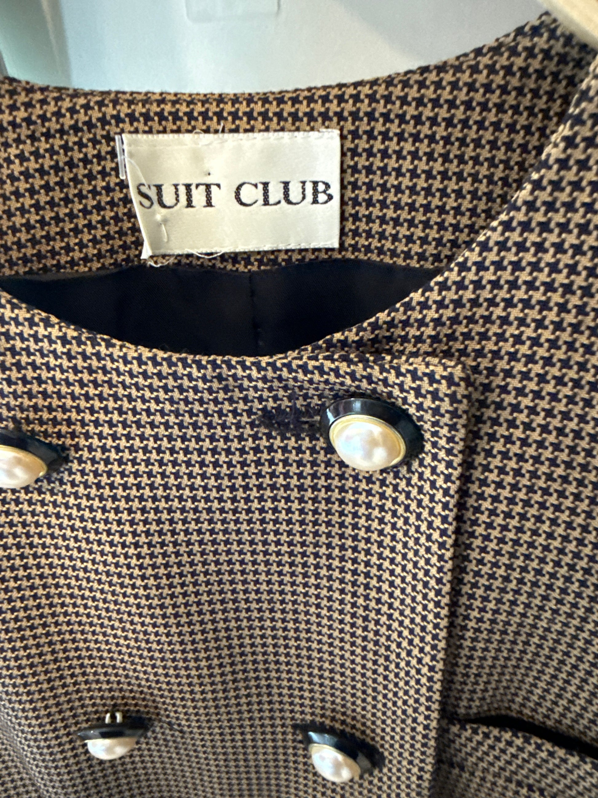 Late 1980s suit club brown and beige houndstooth blazer with strong button hardware.