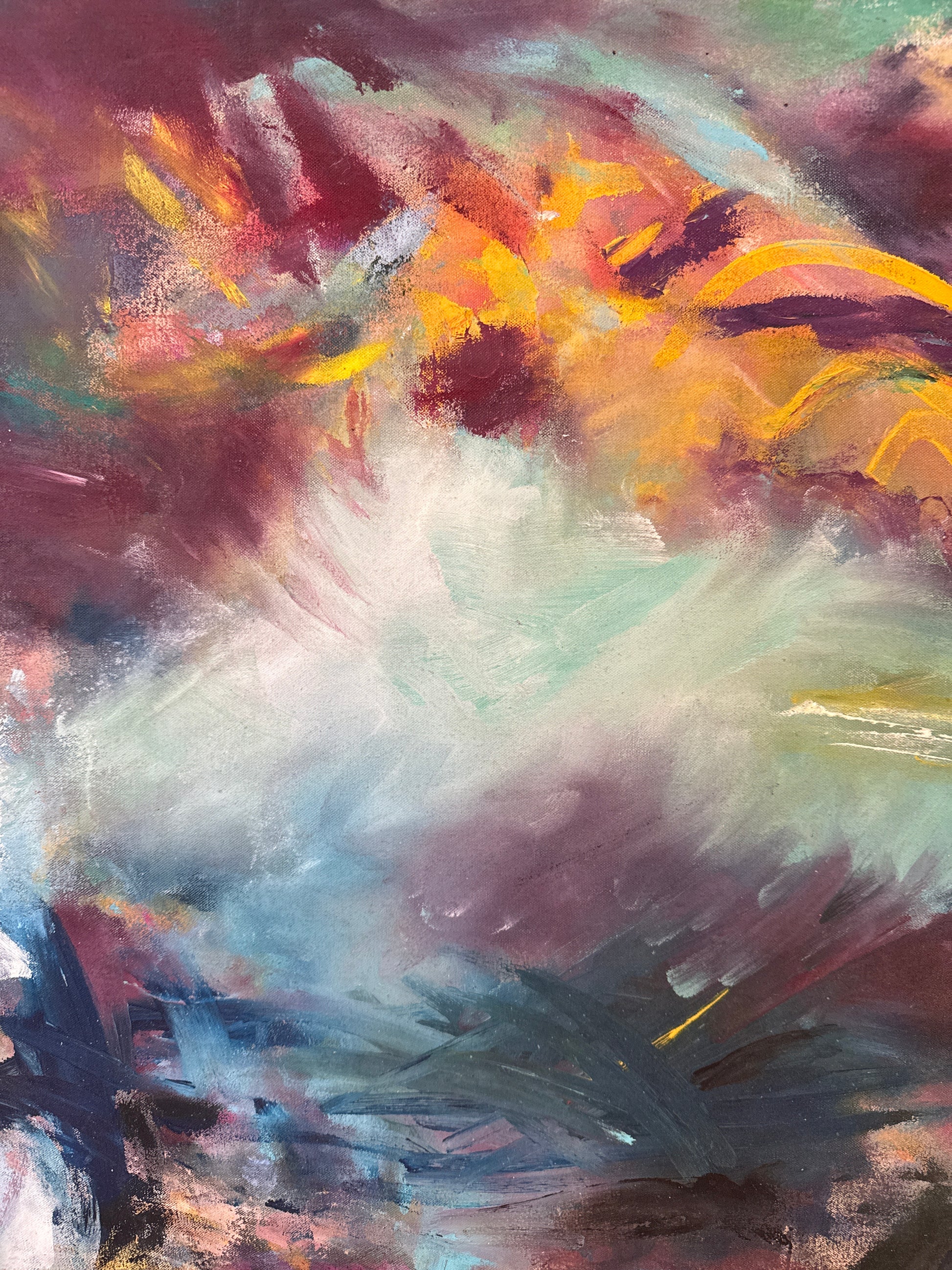 Large vintage mid-century abstract painting with vibrant teal, plum, and mustard tones. A colorful statement artwork perfect for modern, eclectic, or vintage interiors.
