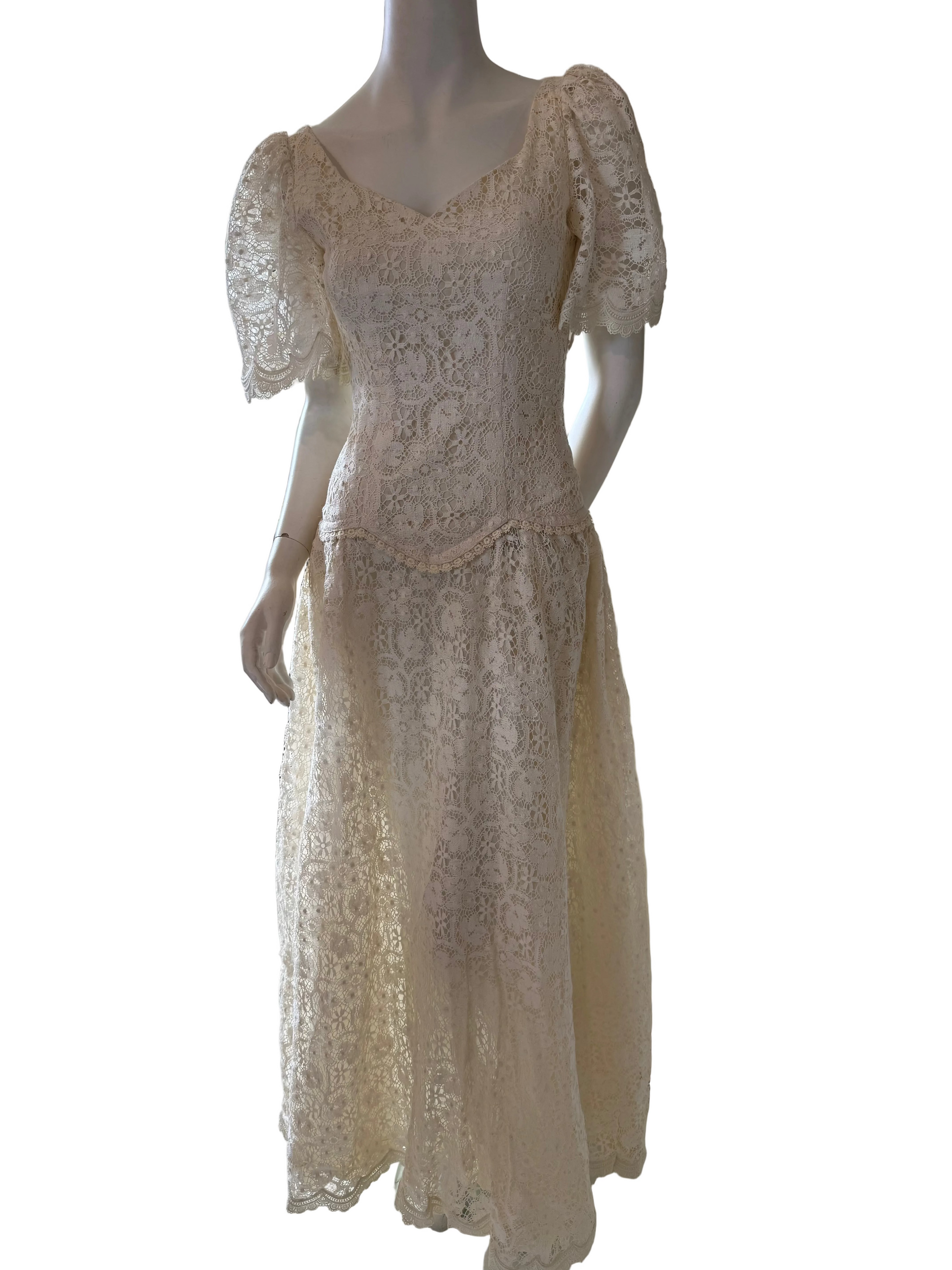 Beautiful vintage 1980s handmade lace wedding gown. Drop waist design with small train. This Casual cotton lace length itself perfectly to a farm, or outdoor countryside event.