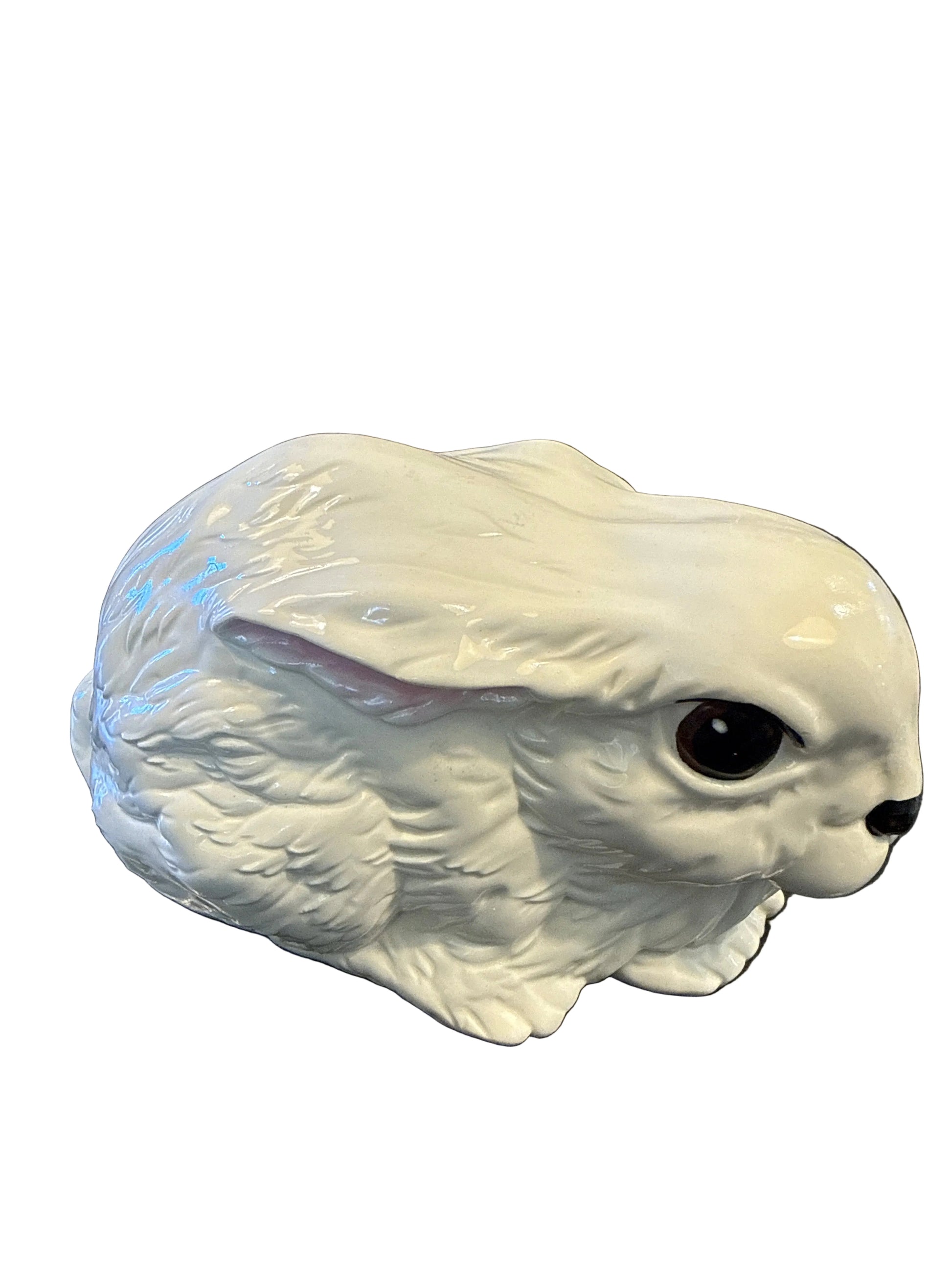 Sweet, sculptural, and irresistibly charming - this vintage ceramic bunny brings a soft storybook presence to any space. Finished in a creamy high-gloss glaze with delicately detailed fur and expressive glassy eyes, she feels equal parts cottagecore and classic heirloom.