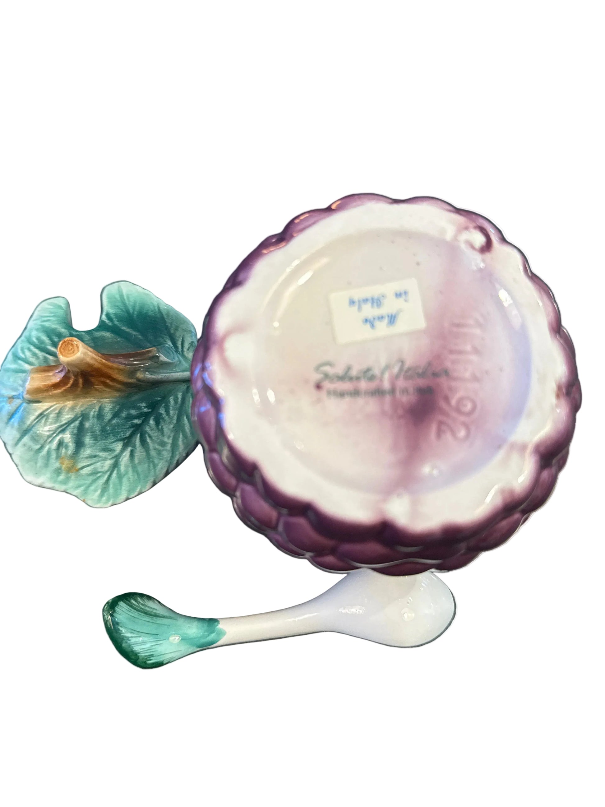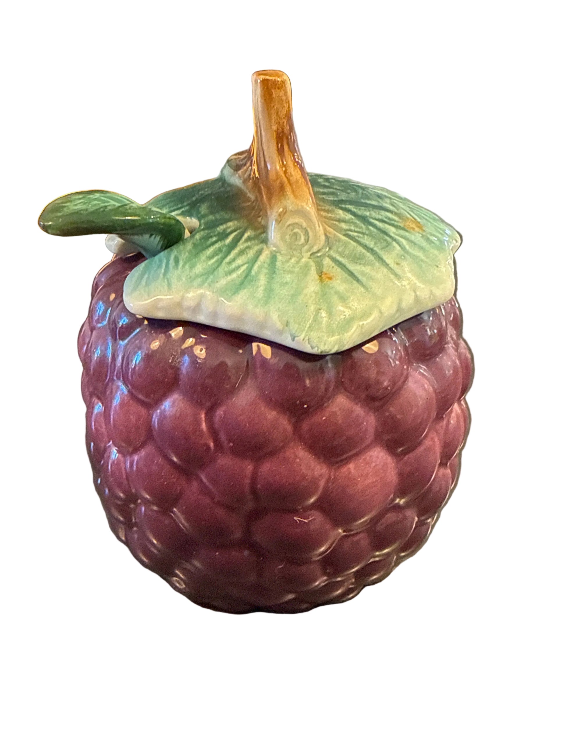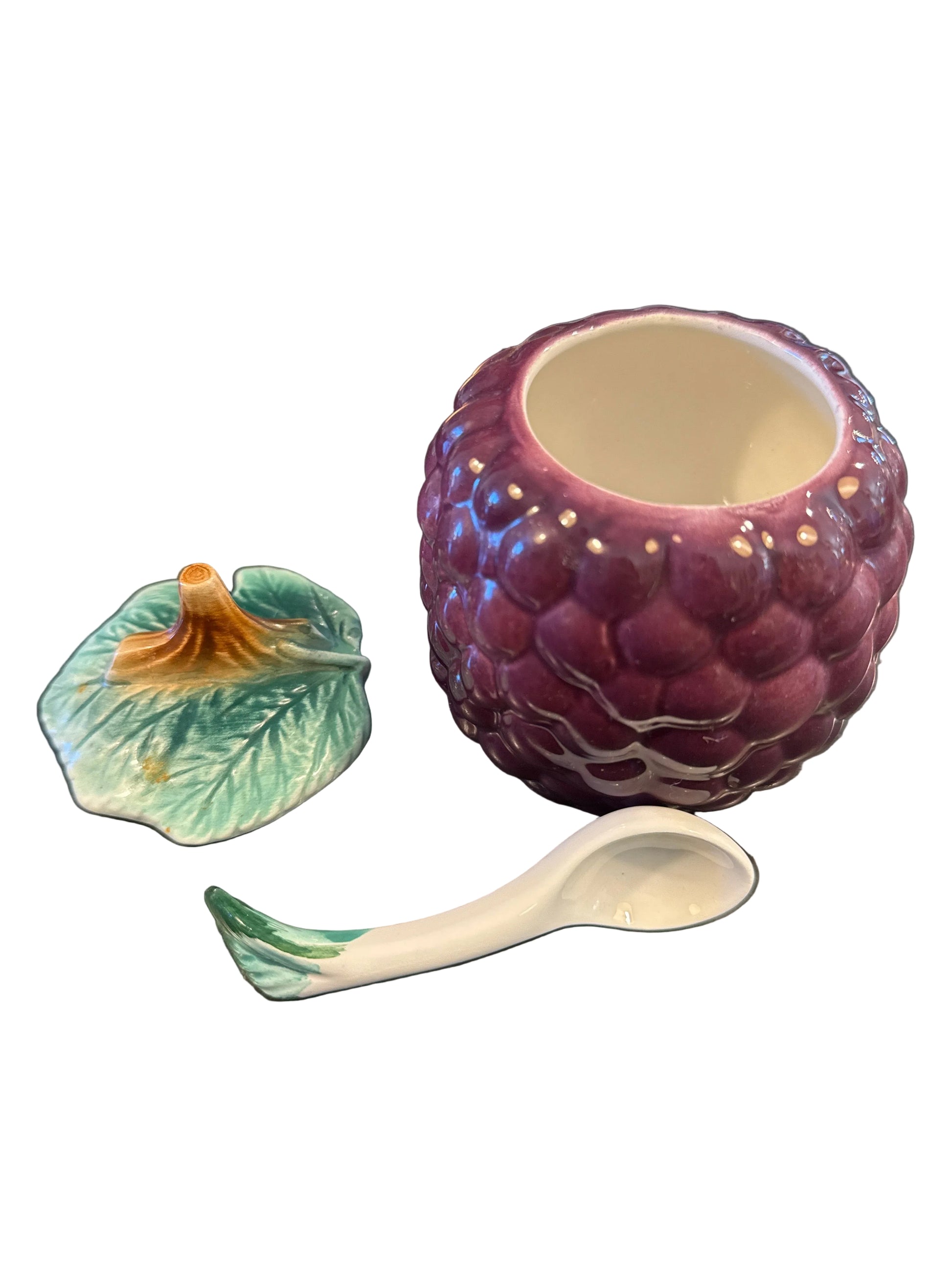 Rich, sculptural, and full of old-world charm- this vintage majolica jam jar is designed in the shape of a plump cluster of grapes, finished in a deep aubergine glaze with dimensional detailing throughout. The coordinating leaf lid and ceramic spoon complete the set, making it as functional as it is decorative.